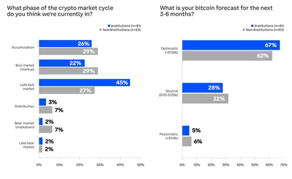 Порядка 45% опрошенных заявили, что биткоин находится на поздней стадии бычьего тренда, а среди не относящихся к категории институционалов — только 27%. Аналитики отметили существенное влияние корпораций с первой криптовалютой на своих балансах. Компании с подобным статусом аккумулировали 3,5% предложения биткоинов. Данные организации продолжат выступать «значимым источником спроса» до конца года, считают аналитики.