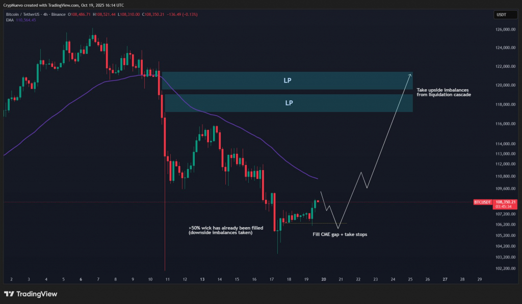Трейдеры ожидают продолжения волатильности в ближайшие дни. Аналитик CrypNuevo в соцсети X считает, что до конца октября произойдет шорт-сквиз. Он отметил большой кластер ликвидаций коротких позиций между $116 000-$117 000 и указал на дисбалансы выше текущей цены как ключевые цели для наблюдения.