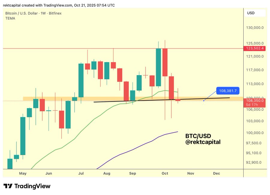 Аналитик под ником Rekt Capital сообщил, что курс столкнулся с сопротивлением в виде 21-недельной скользящей средней (вблизи $110 580, отмечено зеленым), что приводит к возврату в историческую зону спроса (в окрестностях $108 250, оранжевым).