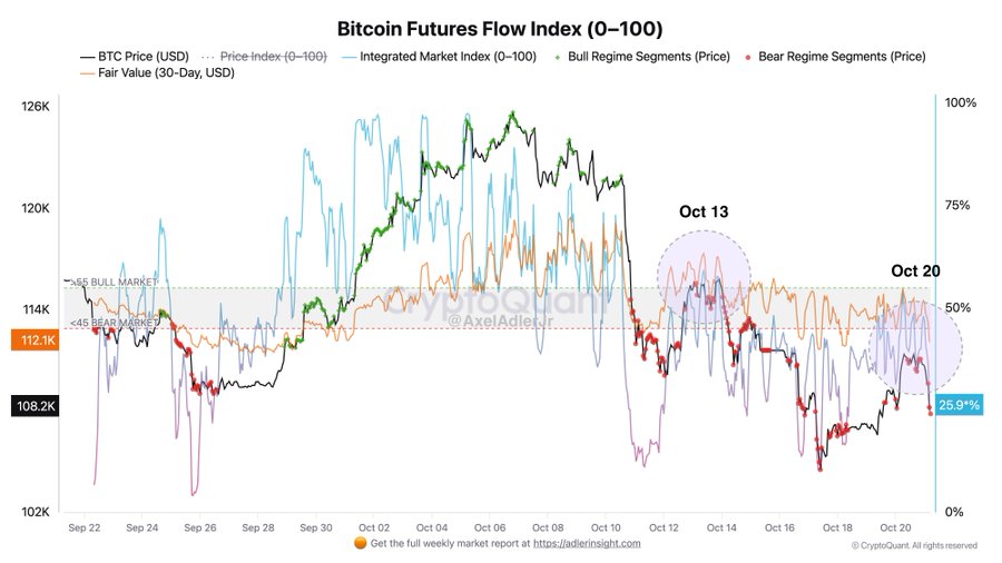 Аналитик констатировал исчерпание энергии у быков после двух неудачных попыток 13 и 20 октября вернуть контроль над ситуацией. Индикатор потоков в биткоин-фьючерсах остается в медвежьей зоне (<45%), а цена продолжает торговаться ниже справедливой стоимости (30-дневной).