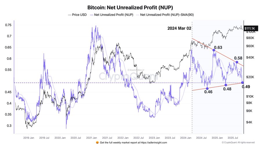 Выводы базируются на анализе динамики чистой нереализованной прибыли. Эксперт отметил сужение диапазона колебаний метрики с марта 2024 года.