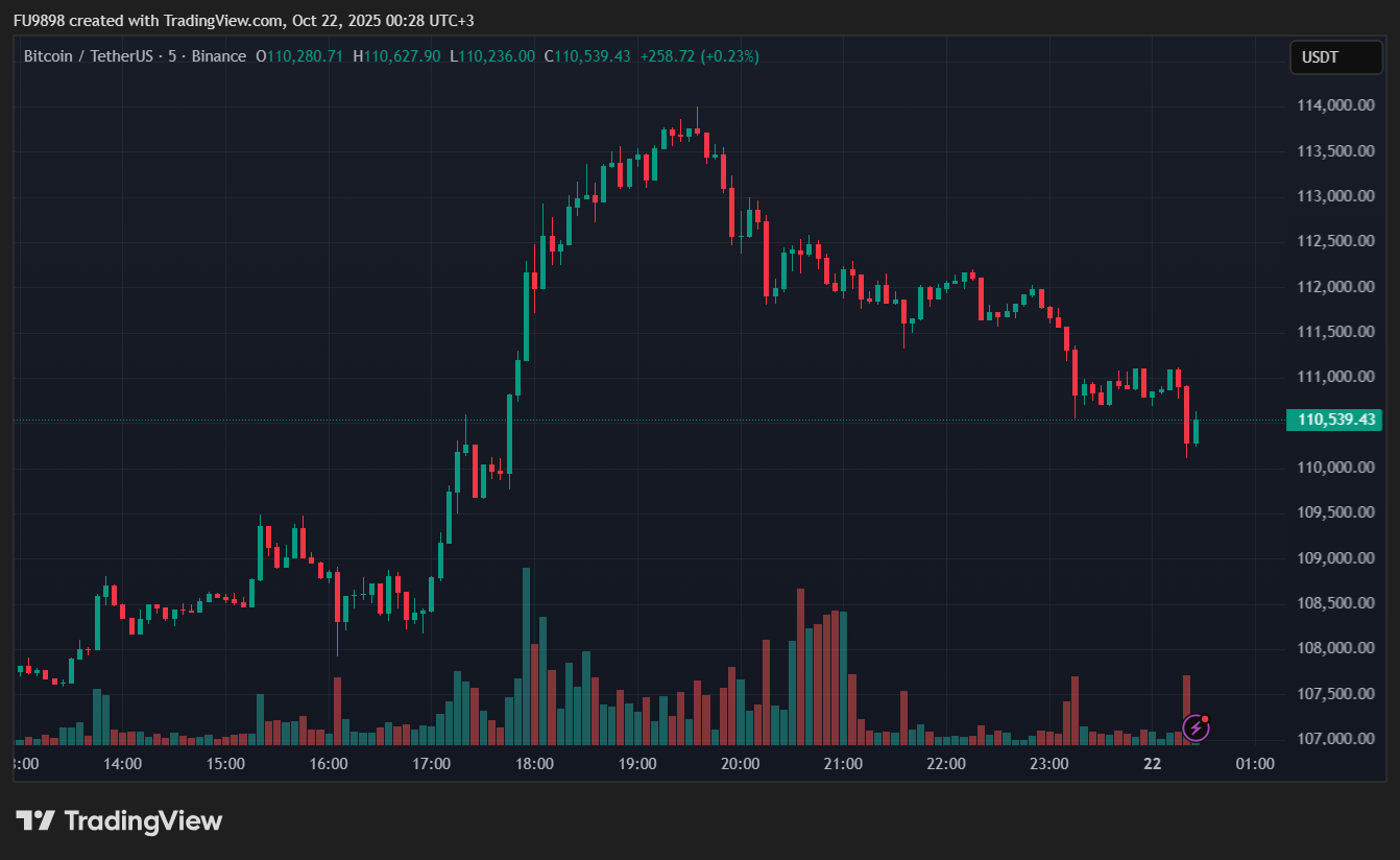 Цена биткоина, которая в течение дня выросла до 114 000 долларов, после этих заявлений упала до 110 000 долларов.