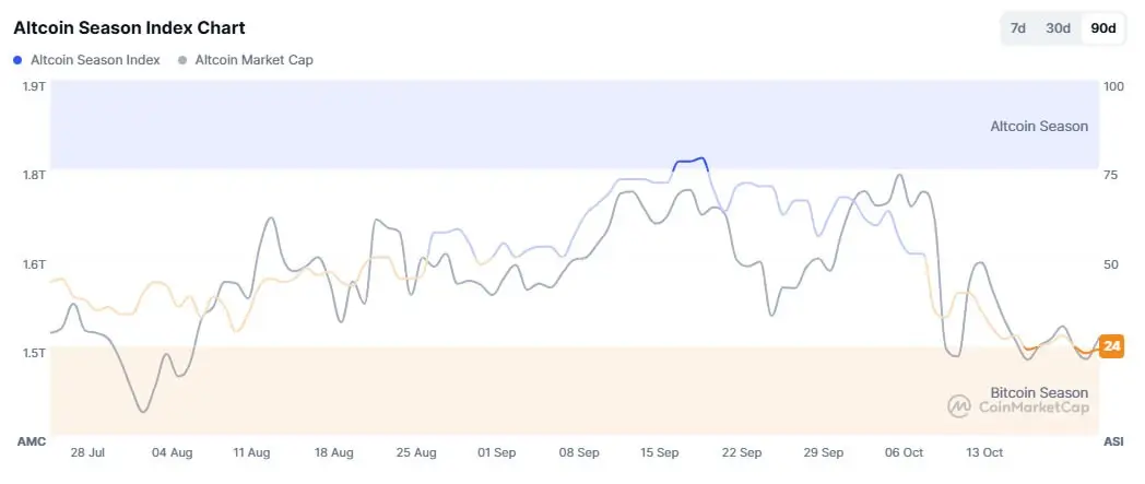 Однако индикаторы сезона альткоинов рассказывают другую историю, поскольку большинство из них находятся на уровнях медвежьего рынка.