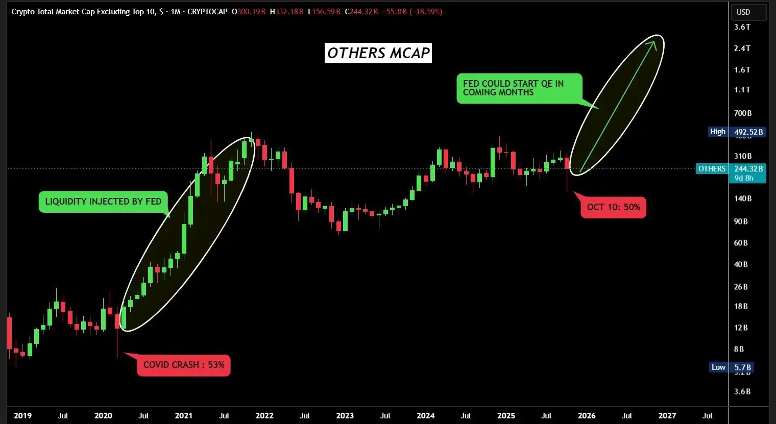 Другой аналитик, инвестирующий в цифровые активы под ником Crypto GEMs, опубликовал график, показывающий, как прошлые инъекции ликвидности со стороны американского центробанка запускали сезон альткоинов.