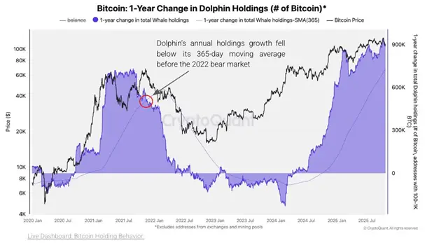 «Исторически рост накоплений в этом сегменте совпадал с бычьими импульсами, в то время как замедление нередко предшествовало фазам распределения и коррекции. В 2025 году дельфины увеличили запасы на 681 000 BTC, тогда как остальные сократили запасы — это подтверждает доминирование институциональных игроков», — объяснили эксперты.