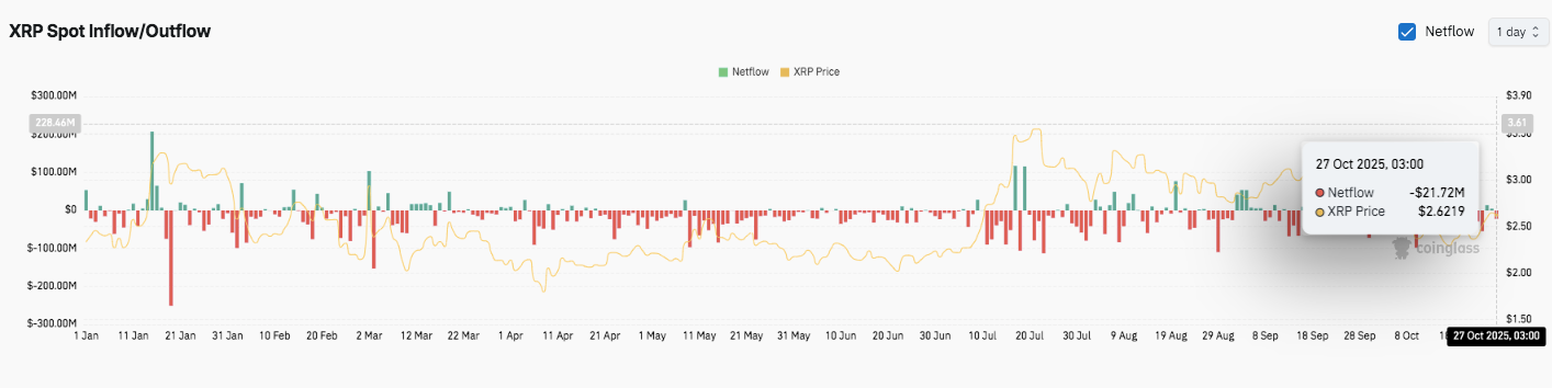 Динамика притока и оттока средств на бирже показывает, что отток преобладал на протяжении большей части 2025 года, что свидетельствует о сохраняющемся давлении на рынке. Тем не менее, недавний чистый отток в размере 21,7 млн долларов, зафиксированный 27 октября, указывает на фиксацию прибыли, а не на панические выходы. Такая динамика указывает на стратегическое накопление, поскольку трейдеры фиксируют прибыль и ждут новых точек входа.
