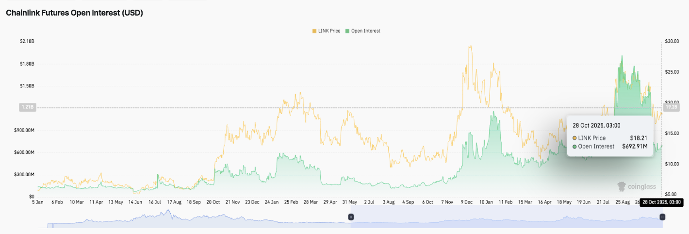 По данным на 28 октября, открытый интерес вырос до 692,91 млн долларов США, а акции LINK торгуются около 18,21 доллара США. Это свидетельствует о значительном отскоке от уровней середины года, когда открытый интерес опускался ниже 400 млн долларов США.