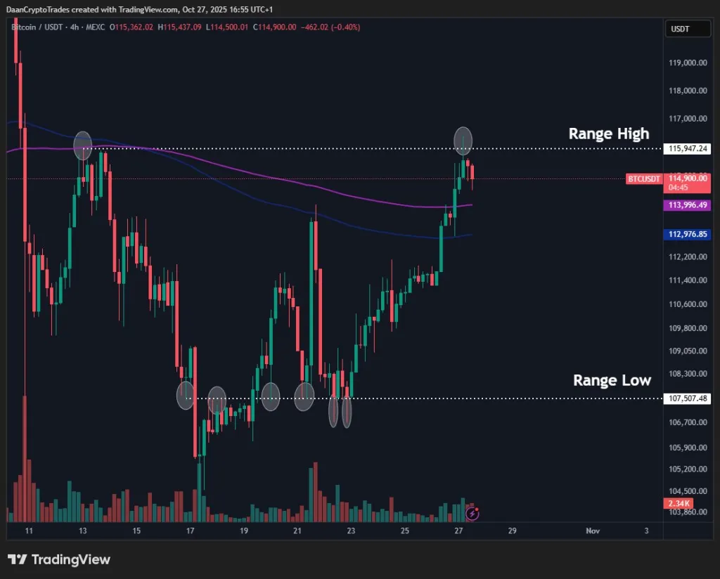 Both $114.5k & EMA could get retested to confirm a reclaim to support$BTC could achieve this via a volatile retest of $114.5k, wicking into the EMA below#Crypto #Bitcoin https://t.co/T7WJgk9mIY pic.twitter.com/hw1chWDSdx