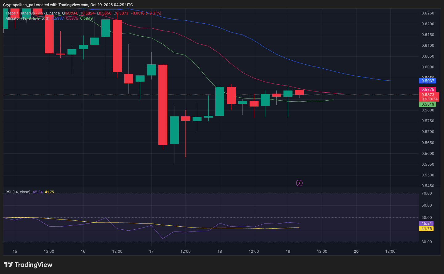 Следующее сопротивление находится на 200-дневной экспоненциальной скользящей средней (EMA) вблизи $9,82, уровня, который ранее ограничивал все попытки восстановления с мая. Закрытие выше этого барьера может открыть путь к области $11–$12, совпадая с верхним нисходящим каналом, сформированным в начале года. С другой стороны, неспособность удержаться выше $7,15 может спровоцировать откат к $6,60, где покупатели в последний раз агрессивно защищались.