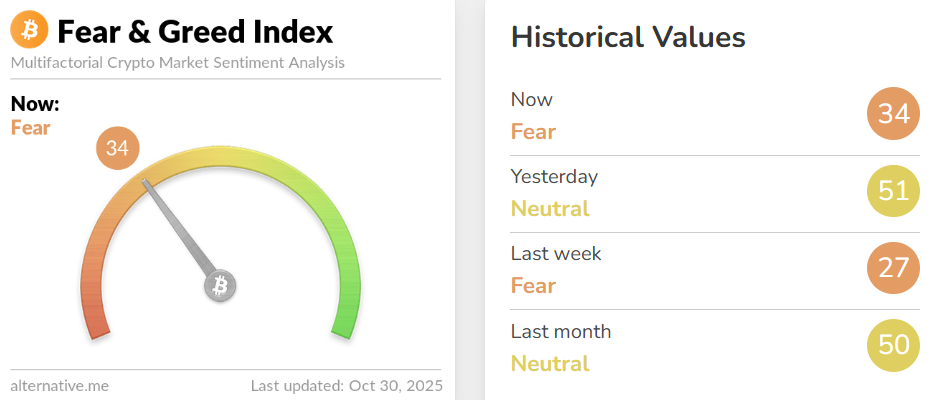 На фоне падения биткоина индекс страха и жадности опустился до 34 пунктов. Еще вчера он находился на уровне 51. Изменения говорят об усилении страха среди биткоин-инвесторов и снижении готовности участников рынка рисковать ради покупки BTC.