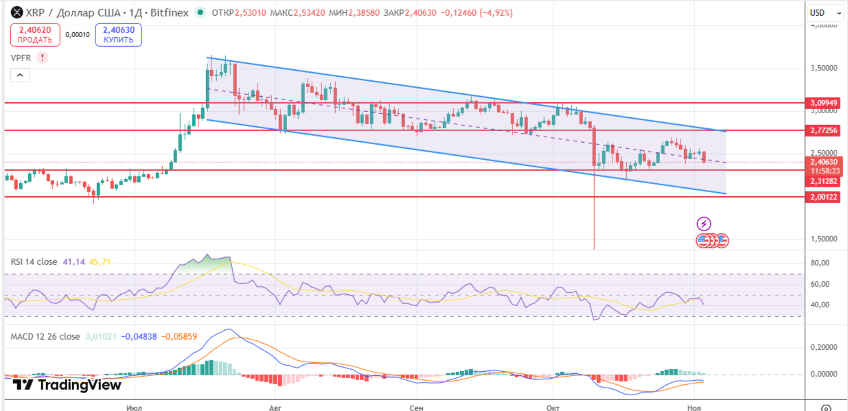 Медвежий сценарий: При отсутствии поддержки и росте риска XRP способен опуститься к $2,31, возможен кратковременный тест $2,00.