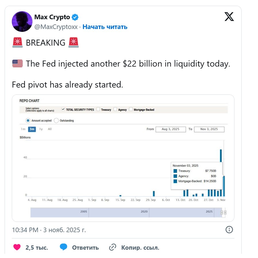Согласно последним данным, 3 ноября Федеральная резервная система провела дополнительные операции репо на сумму $7,75 млрд. Этот шаг был предпринят вскоре после того, как в пятницу ФРС добавила $29,4 млрд в банковскую систему.