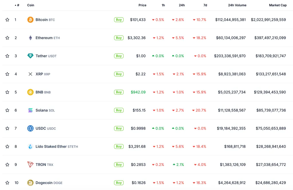 За последние сутки цена первой криптовалюты опустилась почти на 3% — до ~$101 400. Ethereum просел на 5,5%, на момент написания актив торгуется на уровне ~$3300.