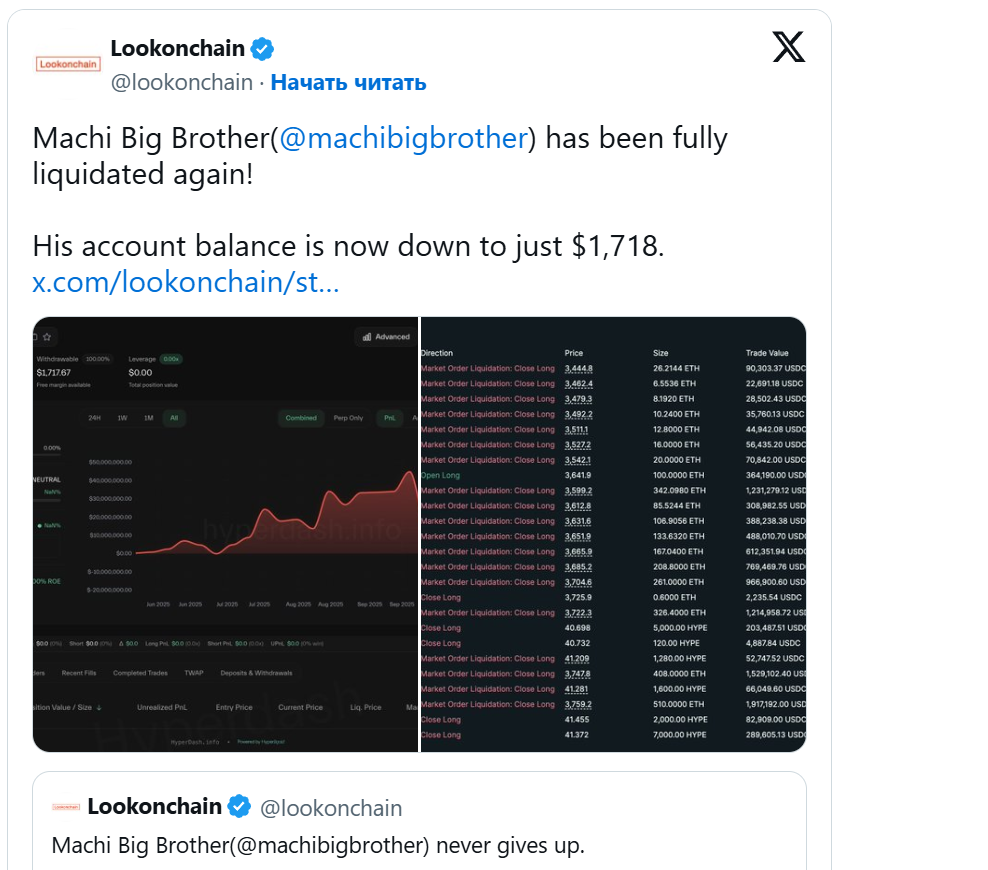 «Анти-CZ Кит сменил шорт по ETH на лонг. Текущие позиции: 130 566 DOGE ($21 000) в лонг, 32 802 ETH ($109 млн) в лонг, 58,27 млн ASTER ($59,7 млн) в шорт, 1,99 млрд kPEPE ($11,3 млн) в шорт», как сообщает Lookonchain в своем твите.