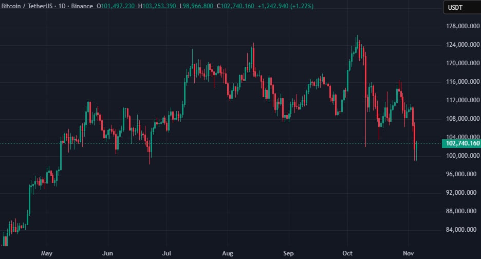 С начала ноября 2025 года биткоин просел с уровней около $110 000 до ниже $99 000. Только за период с 27 октября по 5 ноября падение составило около 15%.