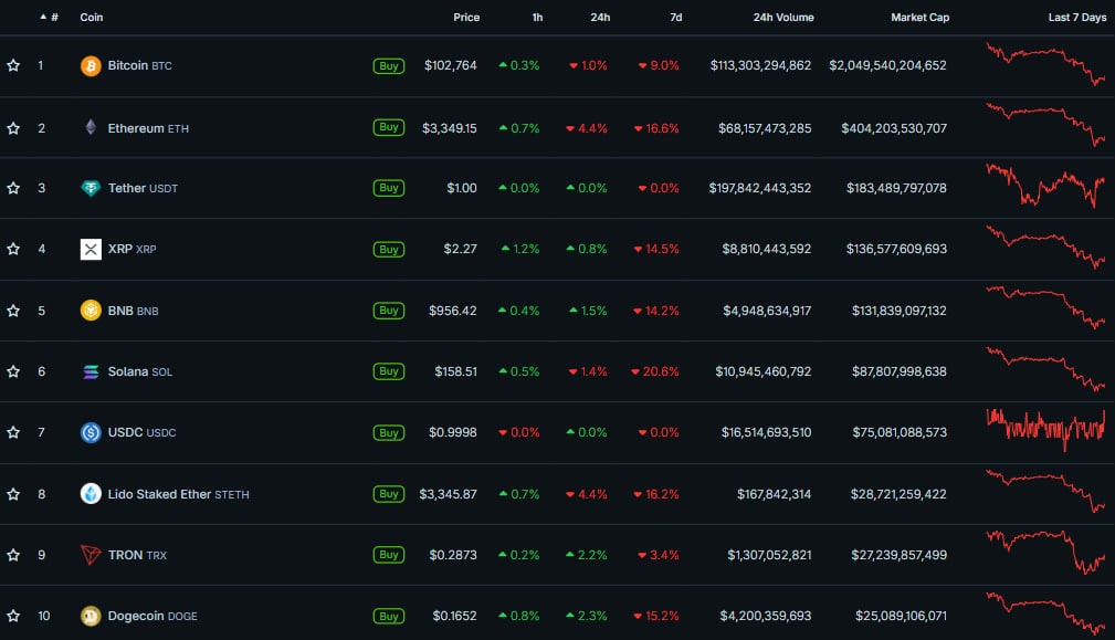 Негативная динамика в секторе альткоинов продолжилась: за последнюю неделю стоимость большинства из них просела более чем на 15%.