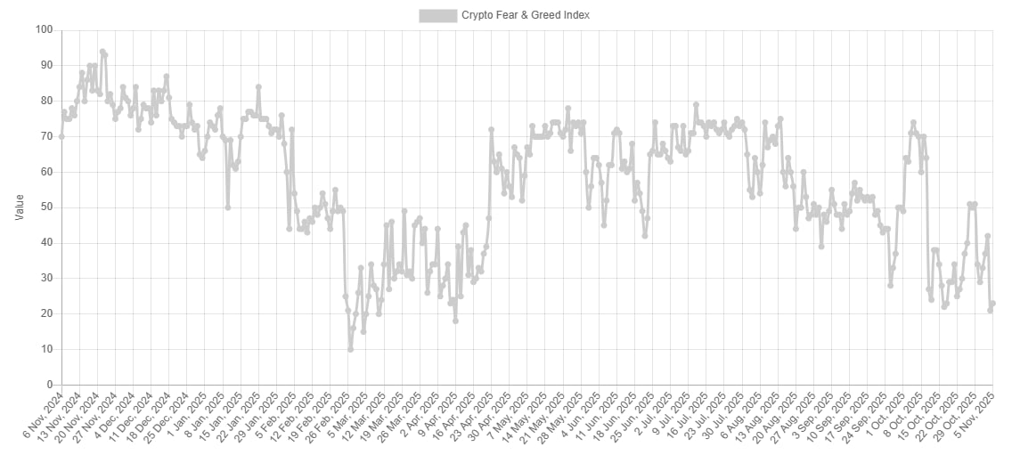 4 ноября индекс страха и жадности упал до 21 пункта — зоны «экстремального страха». Последний раз подобные значения фиксировались в начале апреля 2025 года. Даже во время обвала рынка ночью 11 октября 2025 года показатель опускался лишь до 24 пунктов.