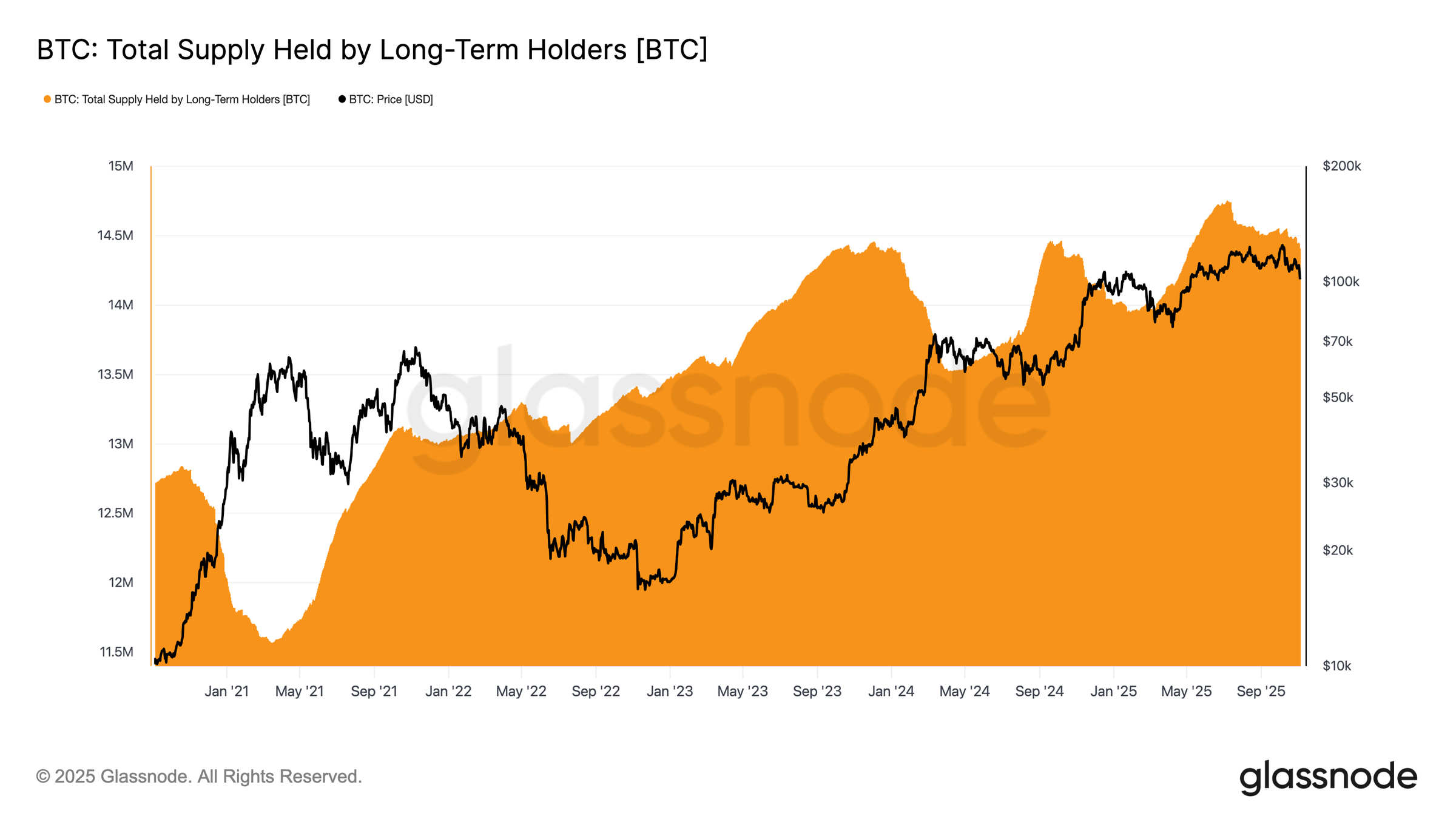 С июля 2025 года первая криптовалюта остается под слабым, но перманентным давлением продаж со стороны долгосрочных держателей.