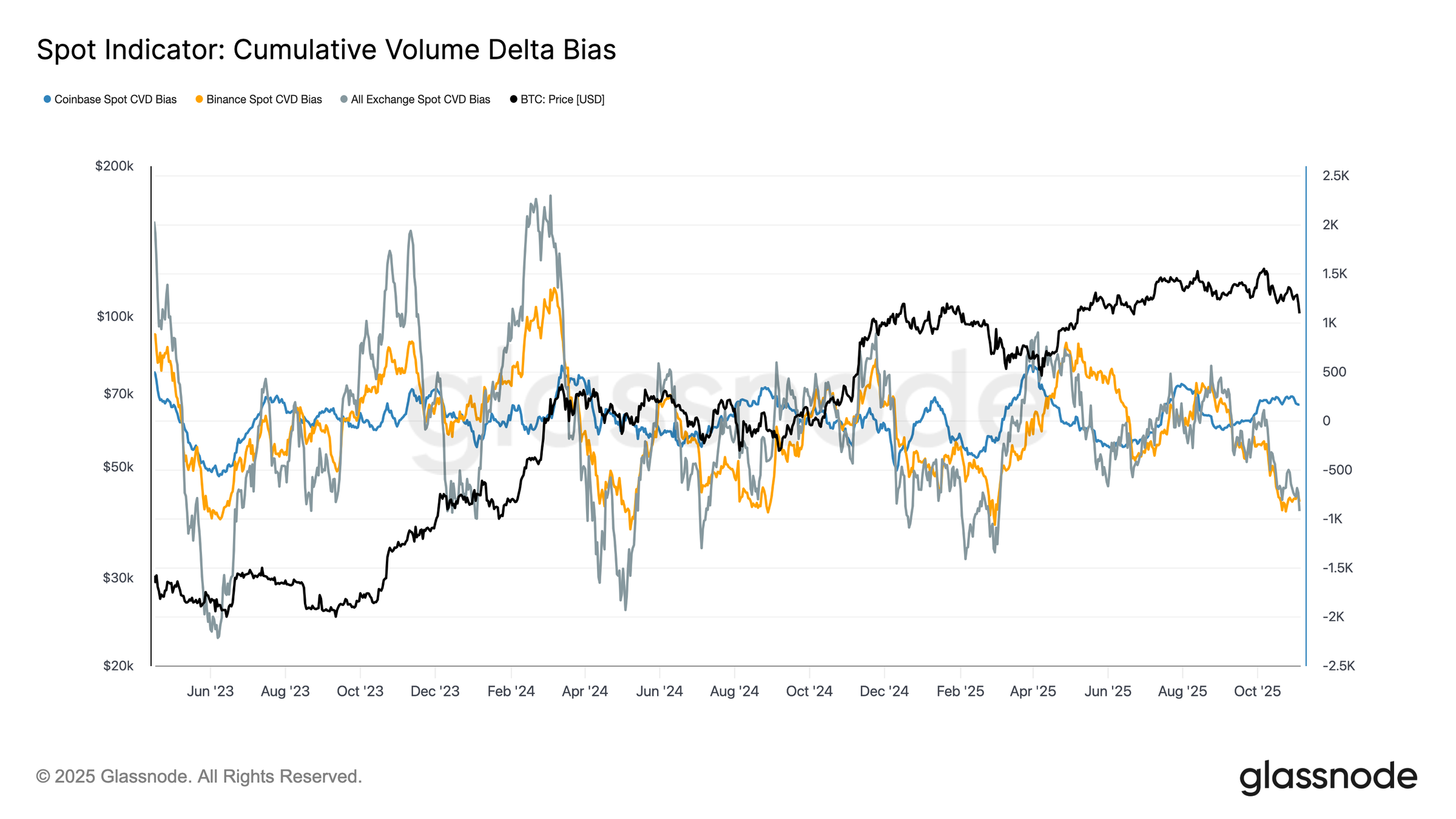 Кумулятивный объем по дельте на спотовом рынке (CVD) на Binance и других платформах стал отрицательным на уровне в –822 BTC и –917 BTC соответственно, что свидетельствует о сохраняющемся чистом давлении.