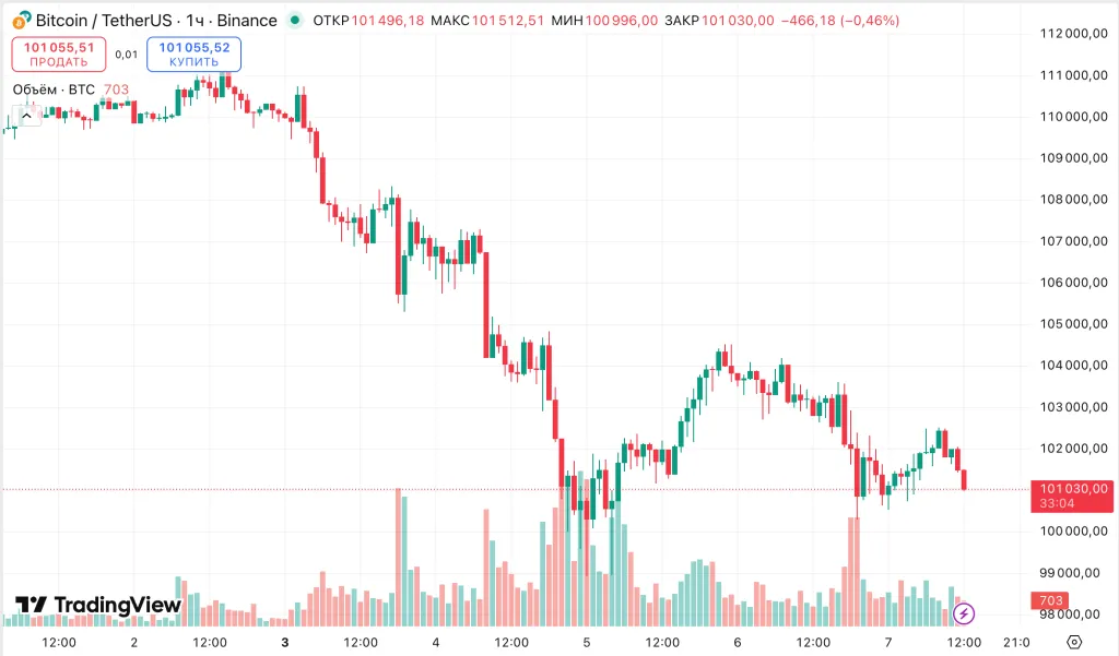 На момент написания биткоин торгуется по ~$101 000. За последние сутки его цена снизилась на 2%.