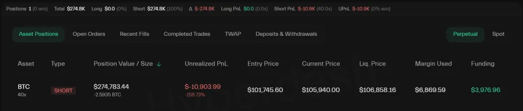 На момент написания основной счет трейдера содержит короткую позицию по цифровому золоту на $274 783 с 40-кратным плечом. Нереализованный убыток составляет $10 903.