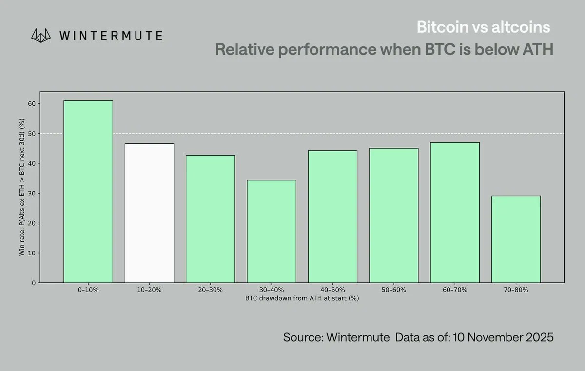 Исторически альткоины начинают уверенно расти, когда биткоин торгуется в пределах 10% от своего исторического максимума (all time high, ATH). Сейчас он отстает от пика примерно на 16%, и в подобных условиях BTC опережает по росту альткоины примерно в 54% случаев. Если цена снижается до ~$100 тыс., вероятность такого сценария возрастает до 58%.