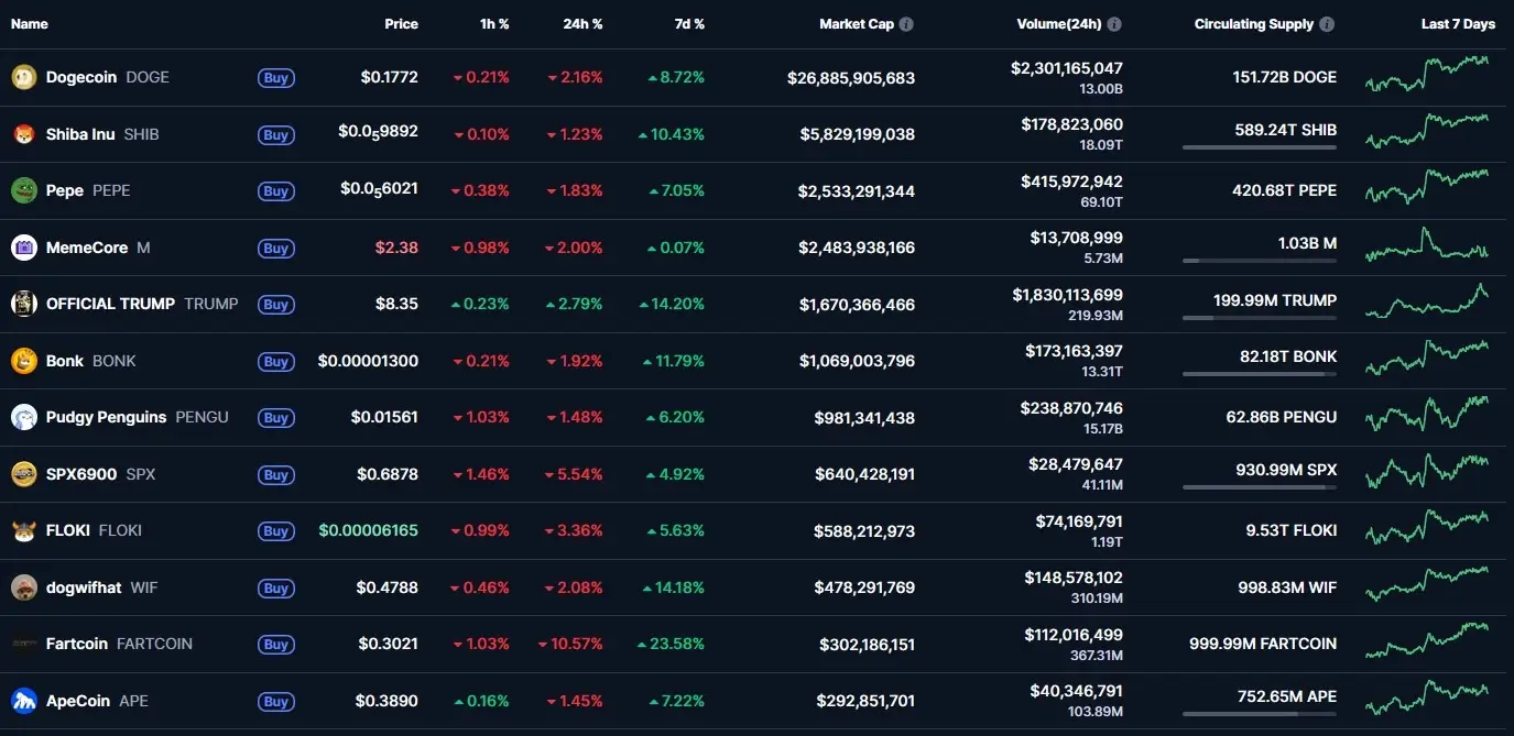Ведущие мемкоины по рыночной капитализации. Источник: CoinMarketCap