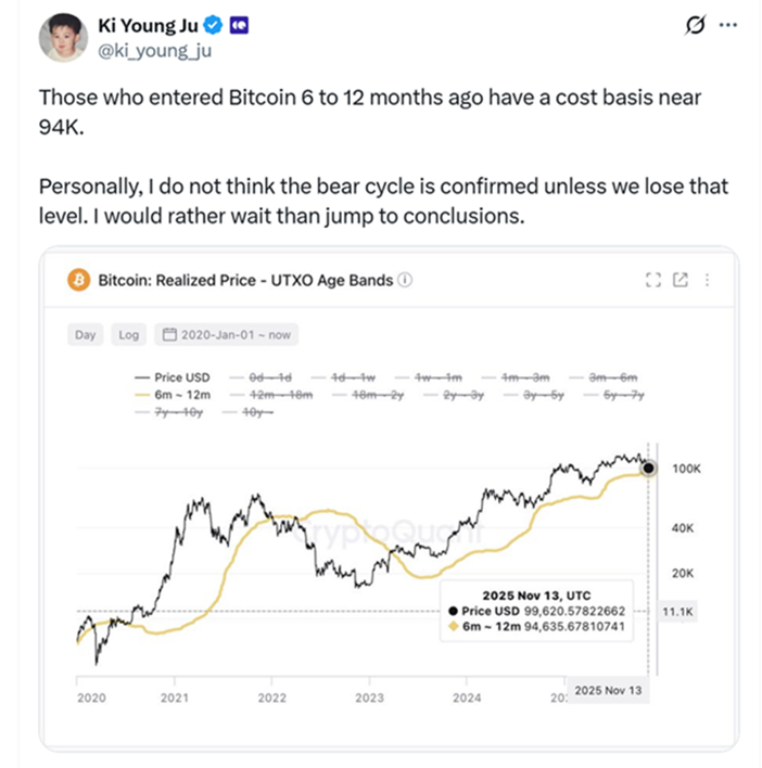 CryptoQuant Ки Ен Джу сообщил, что средняя стоимость покупки тех, кто приобрел биткоин (BTC) в течение 6–12 месяцев назад составляет ~$94 000.