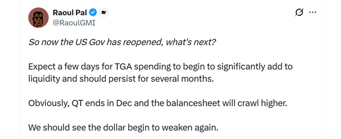 Через несколько дней расходы правительства США после возобновления работы начнут существенно увеличивать ликвидность в следующие нескольких месяцев. Об этом сообщил CEO Real Vision Рауль Пал.