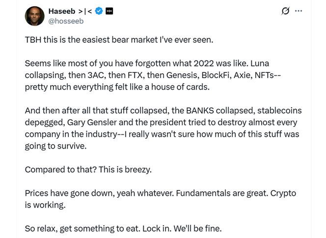 Управляющий партнер Dragonfly Хасиб Куреши призвал не драматизировать текущую ситуацию на рынке. Он напомнил, что в 2022 году события развивались куда болезненнее — «обвал Luna, затем 3AC, FTX, Genesis, BlockFi, Axie, NFT — практически все казалось карточным домиком», указал он.