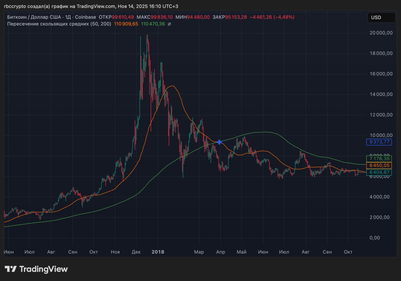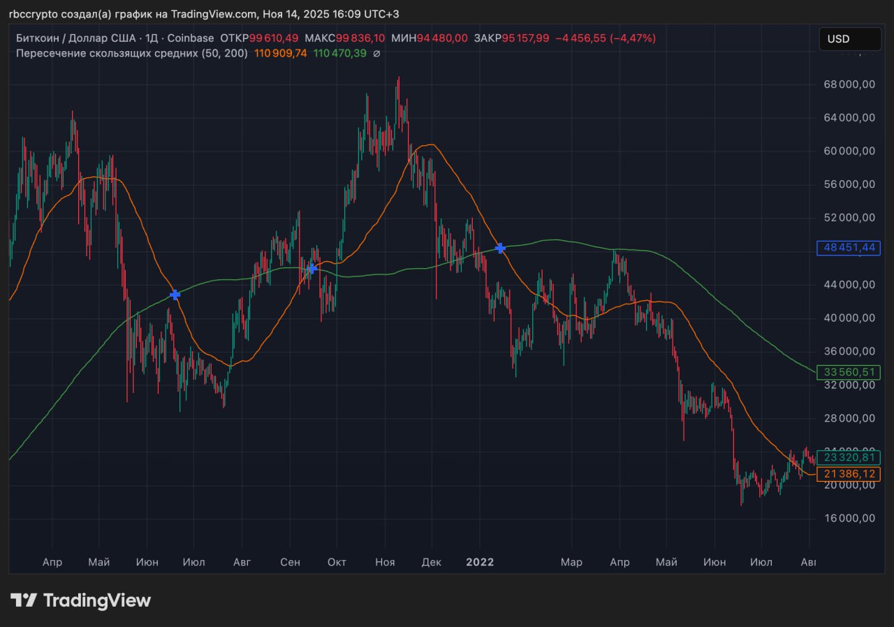 В преддверии «криптозим» 2018 и 2022 годов, после значительных падений курса, на графике биткоина формировались «кресты смерти»: