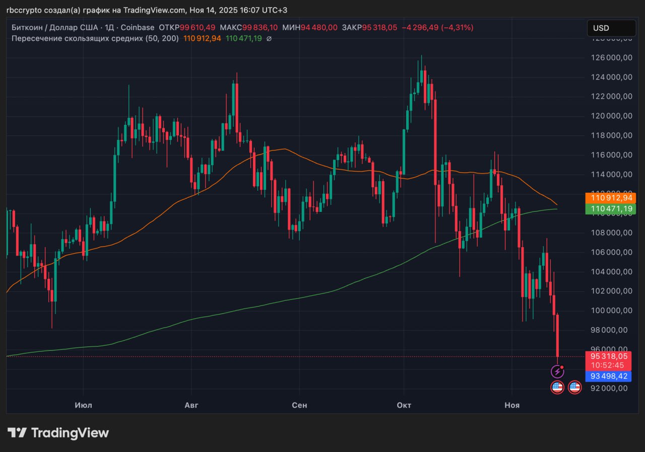 Курс биткоина падает уже два месяца. С 6 октября, когда BTC установил рекорд около $126 тыс., он подешевел на 24% и сегодня, 14 ноября, опустился ниже $95 тыс. впервые за полгода.