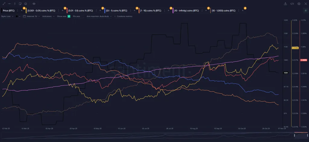 В Santiment также выявили явную дивергенцию в поведении кошельков. Крупные держатели (10-10 000 BTC) стабильно продавали монеты с момента достижения исторического максимума в октябре. В то же время небольшие розничные кошельки (до 10 BTC) продолжали накапливать во время падения.