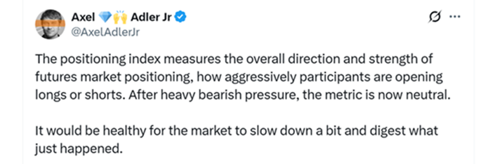 Индекс позиционирования, который оценивает степень агрессии в открытии длинных или коротких позиций во фьючерсах на биткоин (BTC) вернулся к нейтральным отметкам. На это обратил внимание аналитик CryptoQuant Аксель Адлер-младший.