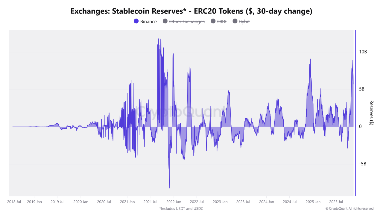 В то же время объем поступлений стейблкоинов на Binance за 30 дней увеличился до $9 млрд. Подобные значения фиксировались лишь несколько раз с конца 2021 года и часто предшествовали крупным ценовым колебаниям.