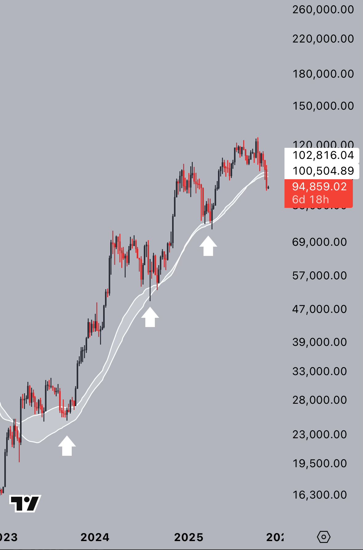 За всю историю биткоина цена опускалась ниже этой линии только четыре раза, и каждый раз это означало смену тренда на медвежий. Последний раз недельная свеча закрывалась под этим уровнем в марте 2023 года.