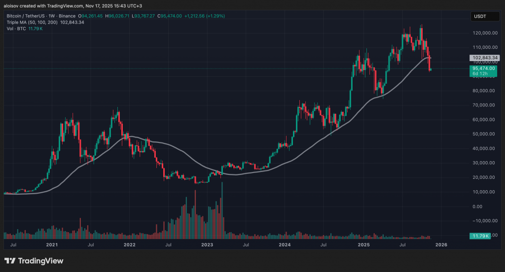 Да, речь идет о 50-недельной скользящей средней, которая сейчас находится в области $102 843. Биткоин пробил ее вниз, и это событие случалось в истории всего четыре раза. И каждый раз означало одно — начало медвежьего рынка.