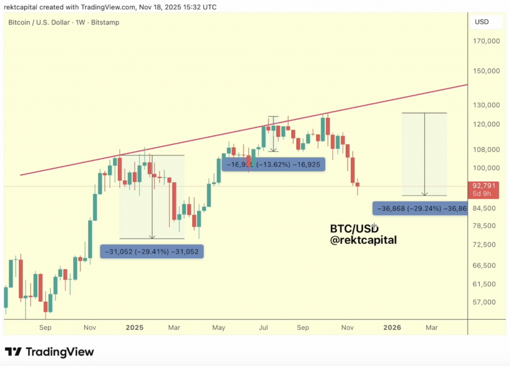 Биткоин упал на 29% от ключевого уровня сопротивления, который в третий раз не дал криптовалюте пробиться выше. Аналитик Rekt Capital отмечает, что это падение стало самым драматичным в текущем цикле и превышает предыдущие коррекции.