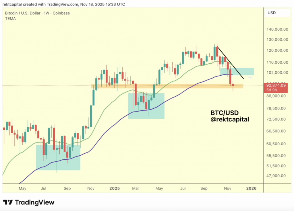 Rekt Capital предупреждает: если отскок составит всего 12% с последующим снижением, это создаст сильное давление продавцов и может указывать на ослабление области спроса.