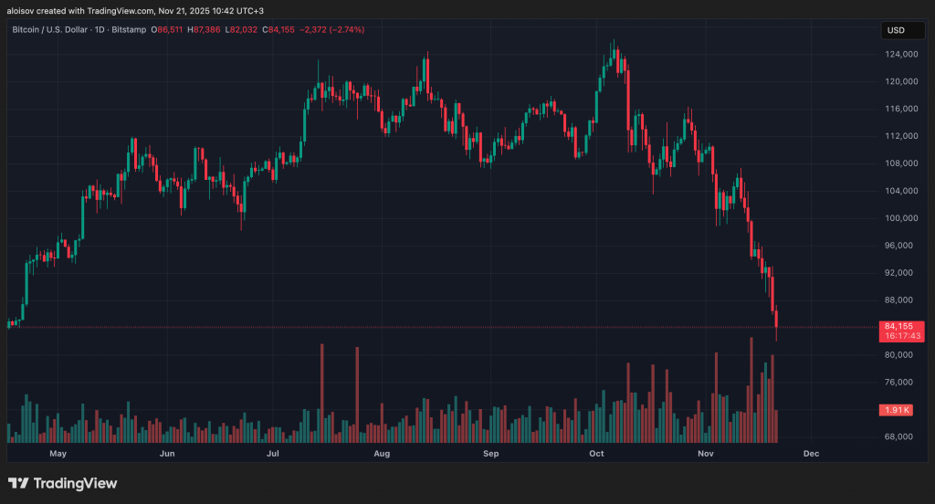 Биткоин протестировал уровень $82 000 впервые за 234 дней и зафиксировав падение на 32% от исторического максимума, установленного 6 октября. Падение первой криптовалюты за сутки 20 ноября составило 5,5%, в то время как Ethereum опустился ниже $2 700, потеряв 45% от своего пика 24 августа.