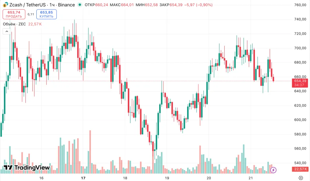 На момент написания цена ZEC составляет $654 (-2,3% за сутки).