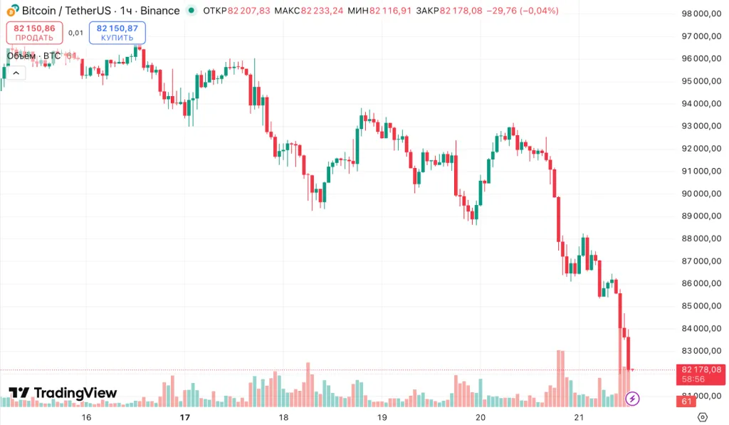 21 ноября курс цифрового золота падал до $82 000 — минимальной отметки с апреля. На момент написания актив торгуется по ~$82 200.