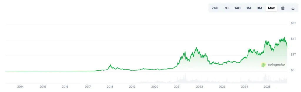 На момент написания рыночная стоимость цифрового золота составляет $1,6 трлн, а всех остальных активов в совокупности — $1,3 трлн. Общий показатель снизился на 8,2% за сутки, провалив рубеж в $3 трлн.