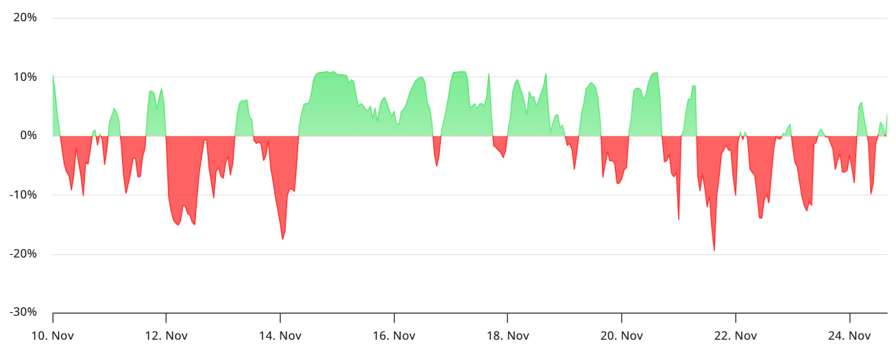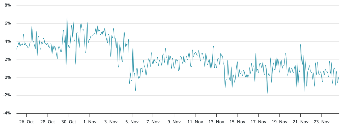С 21 ноября наблюдается устойчивый спрос на шорт по бессрочным контрактам, что отражают негативные ставки финансирования. При нейтральной конъюнктуре метрика обычно колеблется от 6% до 12%, чтобы учесть альтернативные издержки.