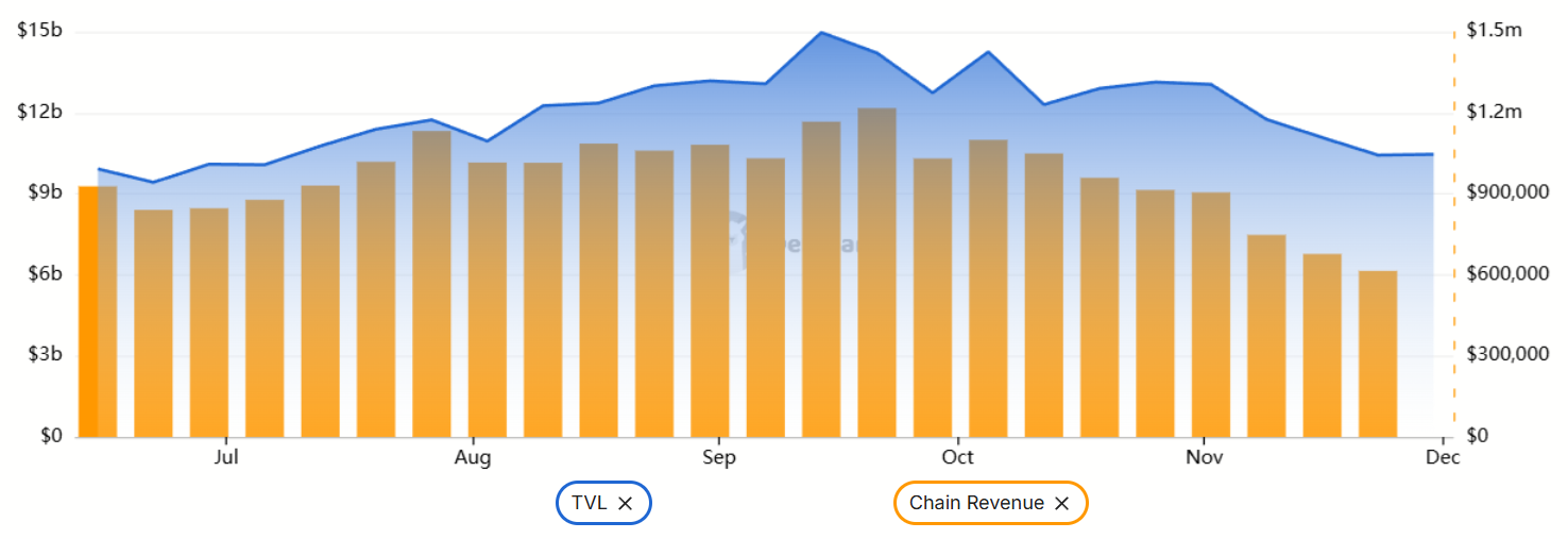 За месяц общий объем заблокированной стоимости (TVL) сократился на 20%, до $10,5 млрд. Совокупный объем еженедельных комиссий упал до минимума с мая. Для сравнения, последний индикатор в Ethereum (ETH) уменьшился всего на 5% за 30-дневный период.
