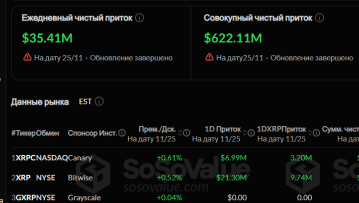Согласно информации из аналитического трекера, по состоянию на 25 ноября суммарный чистый приток средств в XRP-ETF составляет примерно 586,7 млн долларов. Часть этого объёма приходится на фонд Canary Capital (около 322 млн $), остальное — на продукт от Bitwise Asset Management (около 124 млн $). При этом Bitcoin-ETF за тот же период «теряют» капитал.