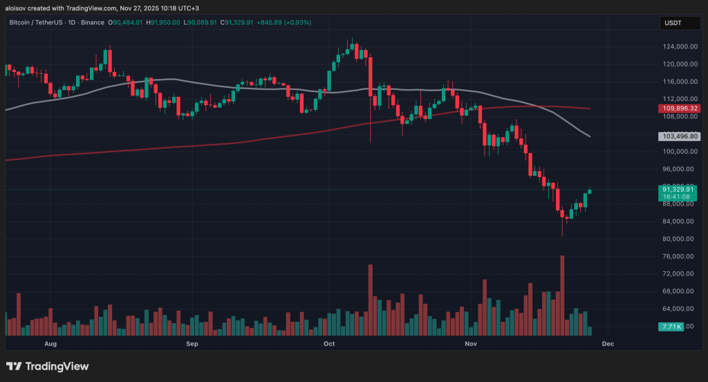 Биткоин вырос на 14% за неделю и достиг $91 950 на бирже Binance, восстанавливаясь после падения к $80 000 21 ноября. Трейдеры и аналитики активно обсуждают дальнейшие перспективы первой криптовалюты, высказывая как оптимистичные, так и осторожные прогнозы.