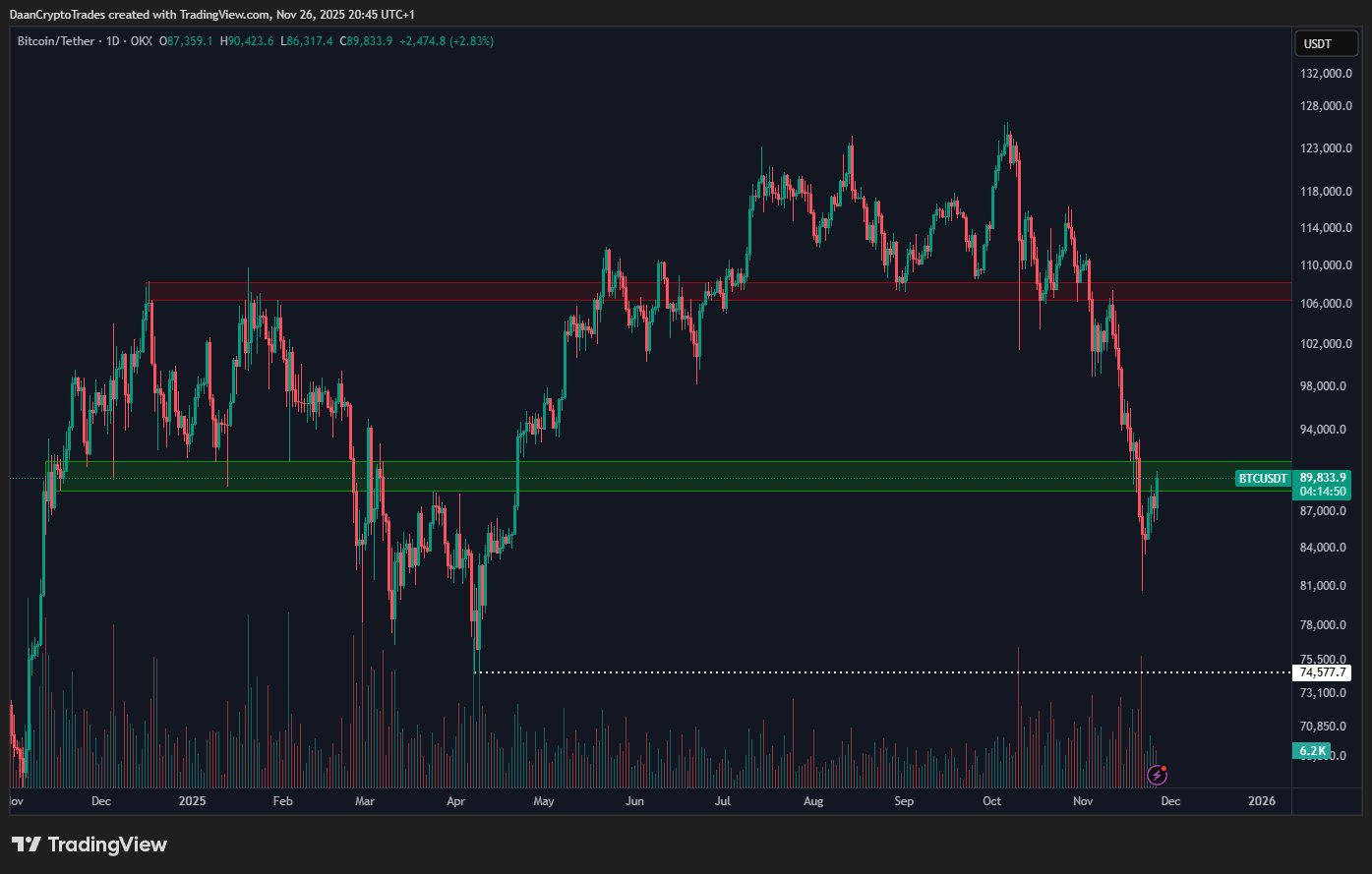 Трейдер Daan Crypto обращает внимание на критическую зону $89 000–$91 000, которая служила поддержкой в конце 2024 года и начале 2025 года. После того как эта область функционировала как сопротивление во время торговых споров между США и другими странами, прорыв выше привел к новым максимумам. По мнению аналитика, закрепление выше этого уровня откроет путь к дальнейшему росту.