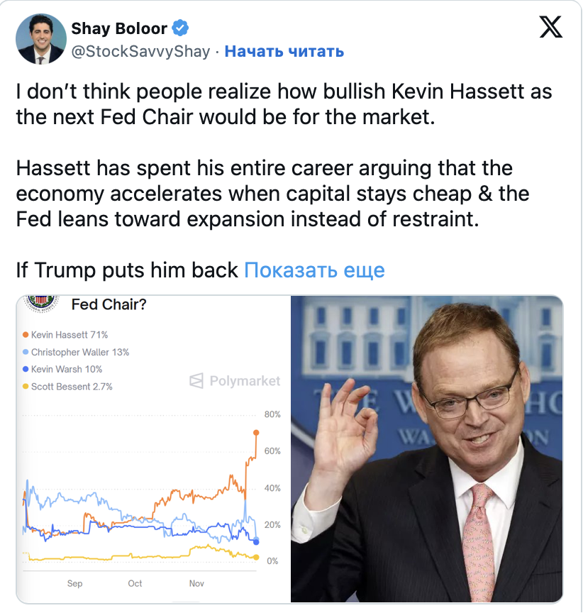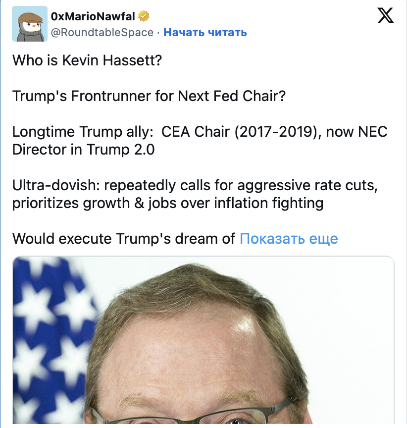 В настоящее время Хассетт возглавляет Национальный экономический совет, став ключевым голосом в экономической команде Трампа. Его широко воспринимают как функционера с гораздо более мягкой позицией, чем у Пауэлла. Инвесторы расценивают его назначение как потенциальный триггер для ускорения смягчения монетарной политики.
