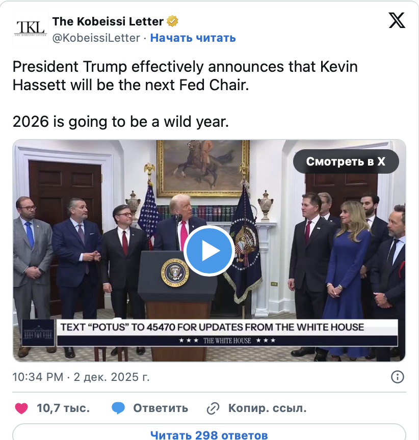 Тем не менее, рынки ожидают немедленных последствий, если Хассетт займет пост. «Голубиная» ФРС, вероятно, ускорит снижение ставок в 2026 году и ослабит доллар США. Кроме того, это приведет к повышению ликвидности на рынках рисковых активов.